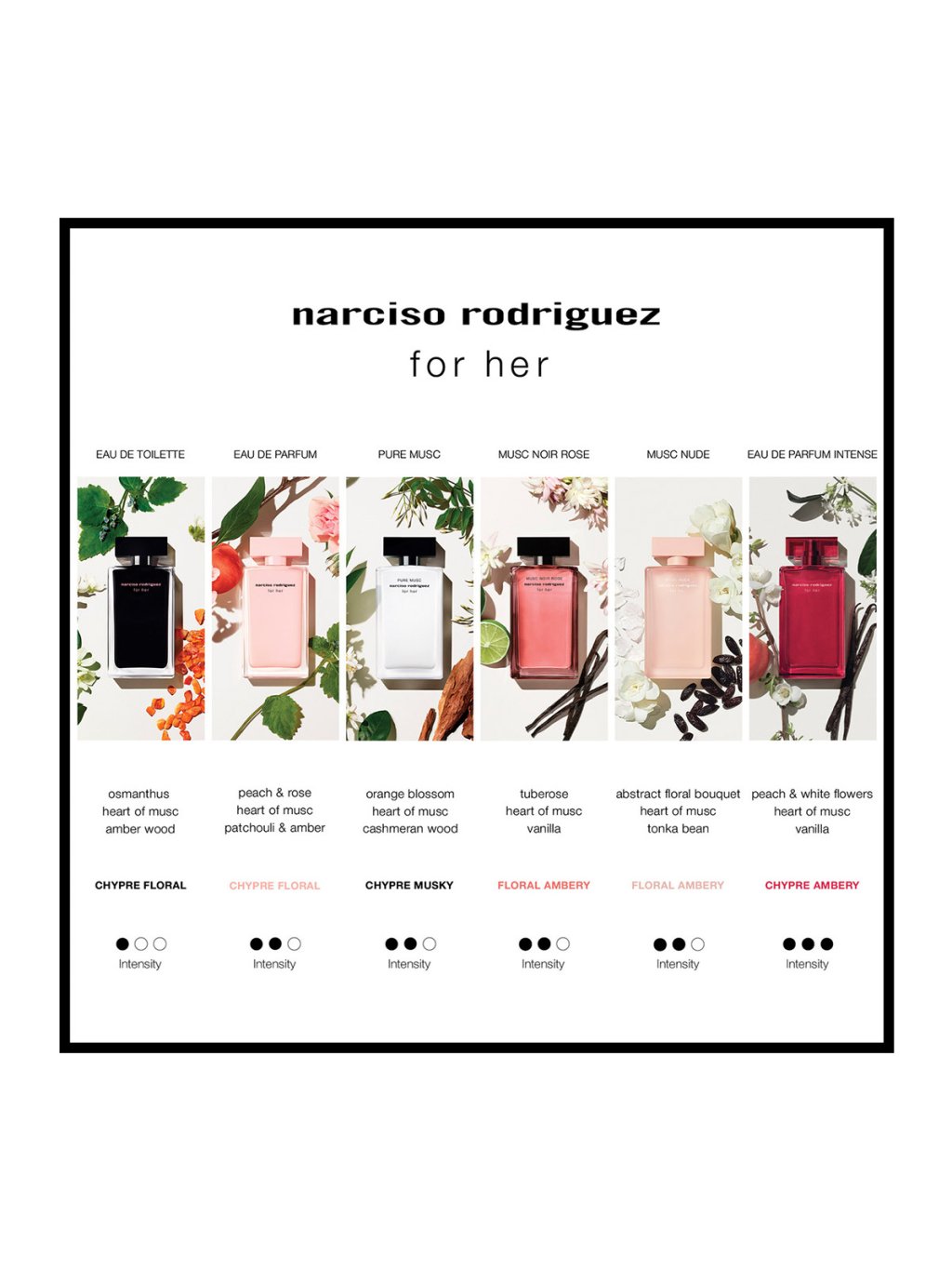 Jednoduchost a podstatnost, vedená ženskostí a elegancí. Řada For her je darem Narcisa Rodrigueze ženám a poctou jejich vnitřní kráse. Patentované srdce pižma, které se nachází v každé vůni For her, vezme uživatele na smyslovou cestu. For her Eau de Toilette se soustředí na tři vůně. První tón připomíná „med z květů“. Jedná se o sluneční pižmo s tóny pomerančového květu a osmanthu. Dále v parfému pulz „ambry“ využívá pižmo nejunikátnějším způsobem, jeho jemnost obklopuje ženu, která jej nosí, ambrou a vanilkou. Nakonec „dřevitý“ puls podtrhuje pižmo tóny vetiveru, které umocňují smyslnost vůně.